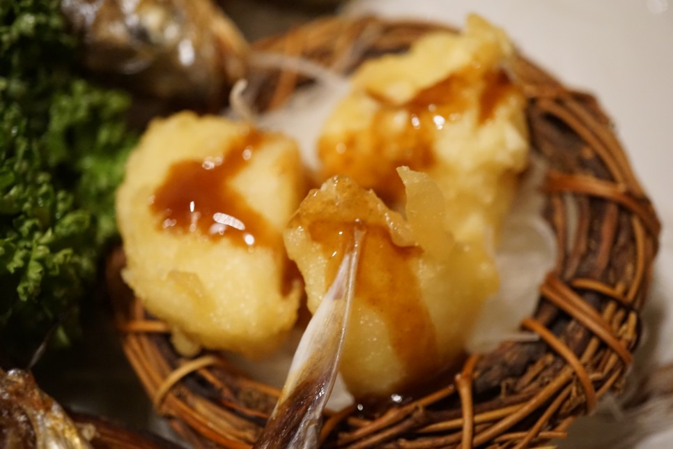 깻잎튀김, 고구마튀김, 새우튀김, 대게살 튀김이 나왔습니다
