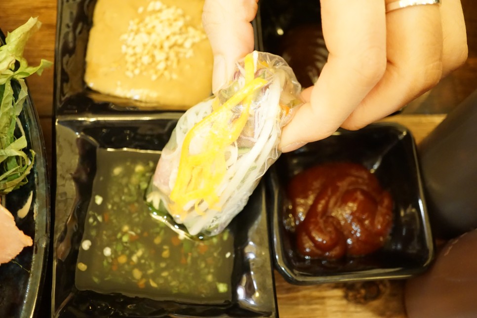 안쪽에 피쉬소스를 듬뿍 넣어주시고 반은 칠리소스에 찍어서 먹고