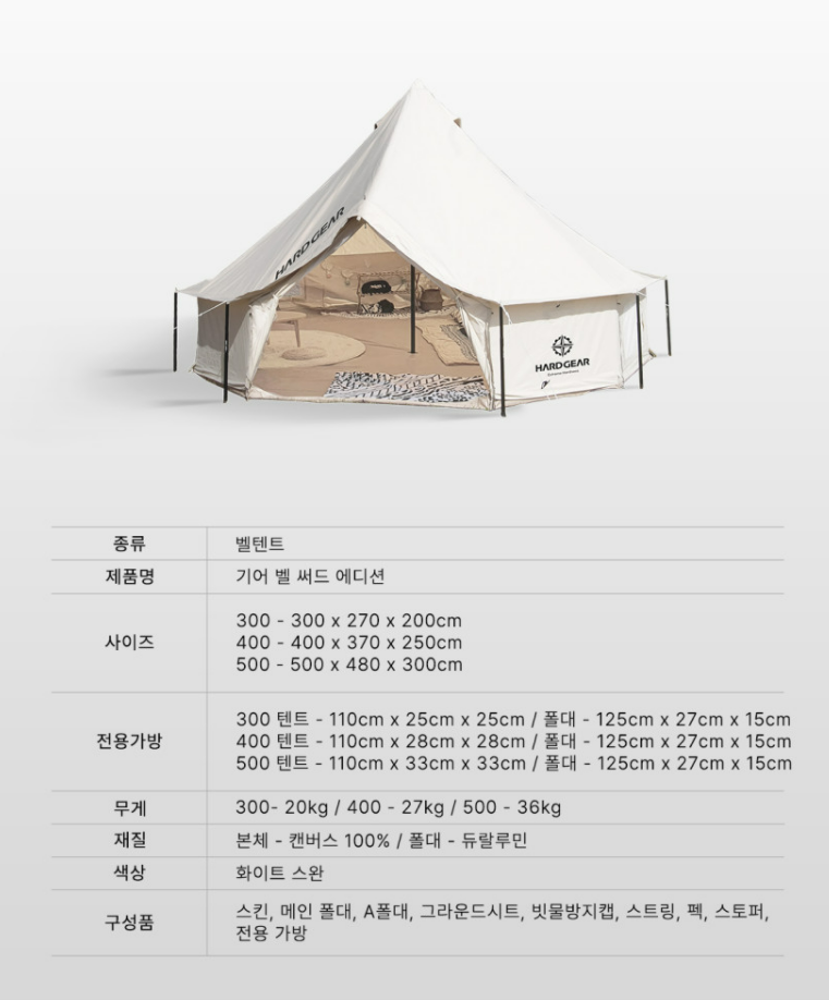 하드기어 벨텐트500 그중 써드 에디션 화이트 스완의 스펙은 다음과 같습니다.