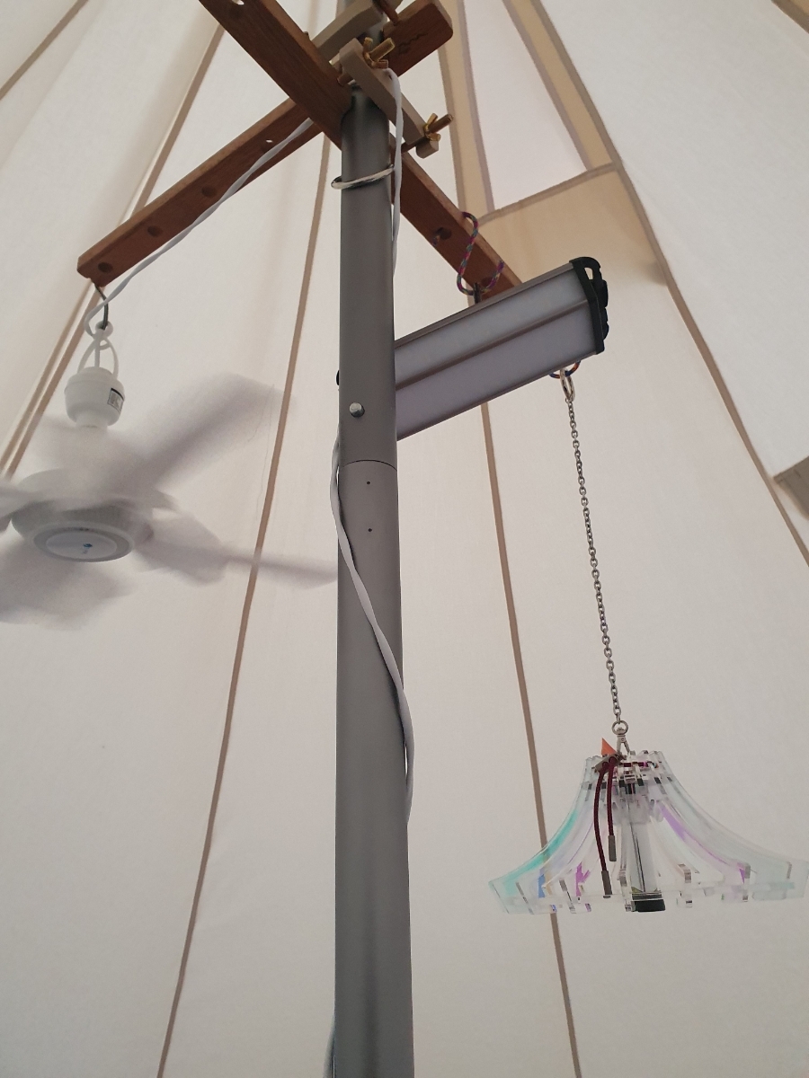 메인 폴에는 거치대를 설치하고 조명과 타프팬을 설치합니다.