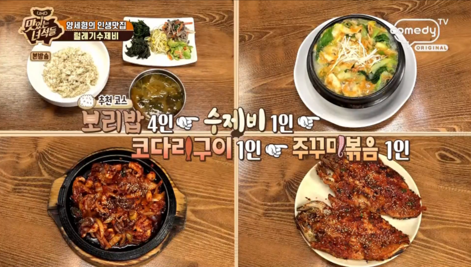 보리밥을 일단 드시고, 수제비, 코다리구이, 쭈꾸미볶음을 시키는걸 추천합니다.