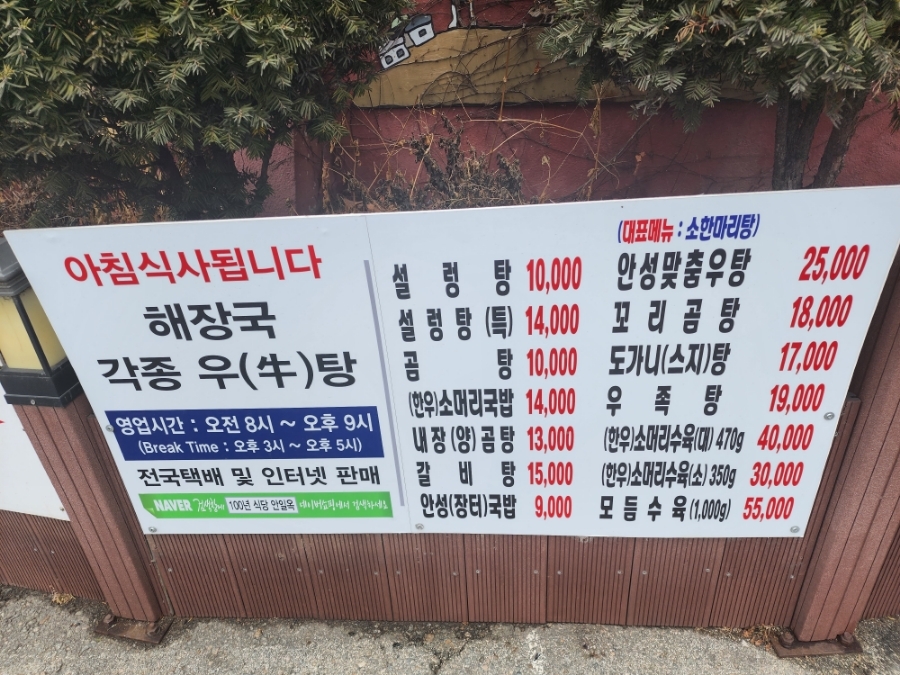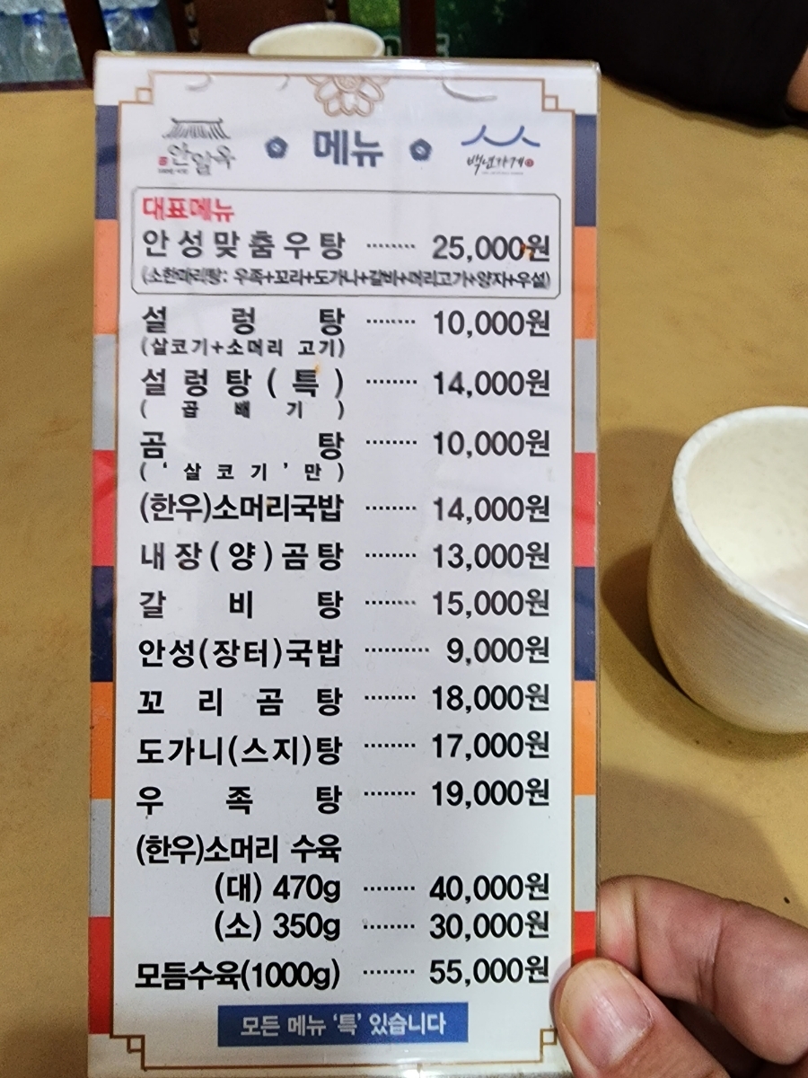 대표메뉴 : 안성맞춤우탕 25,000원, 설렁탕 10,000원, 장터국밥 9,000원