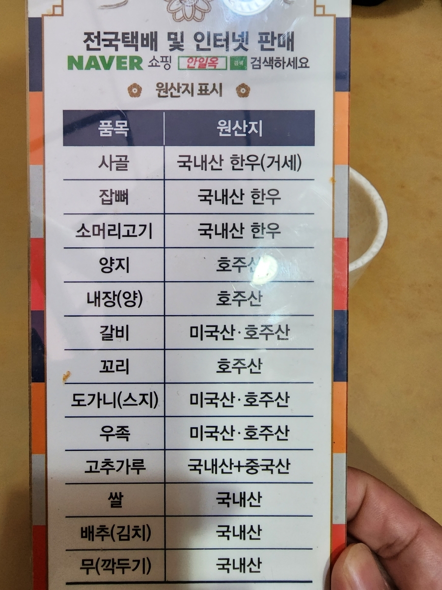 안성 안일옥 본점의 메뉴판입니다.