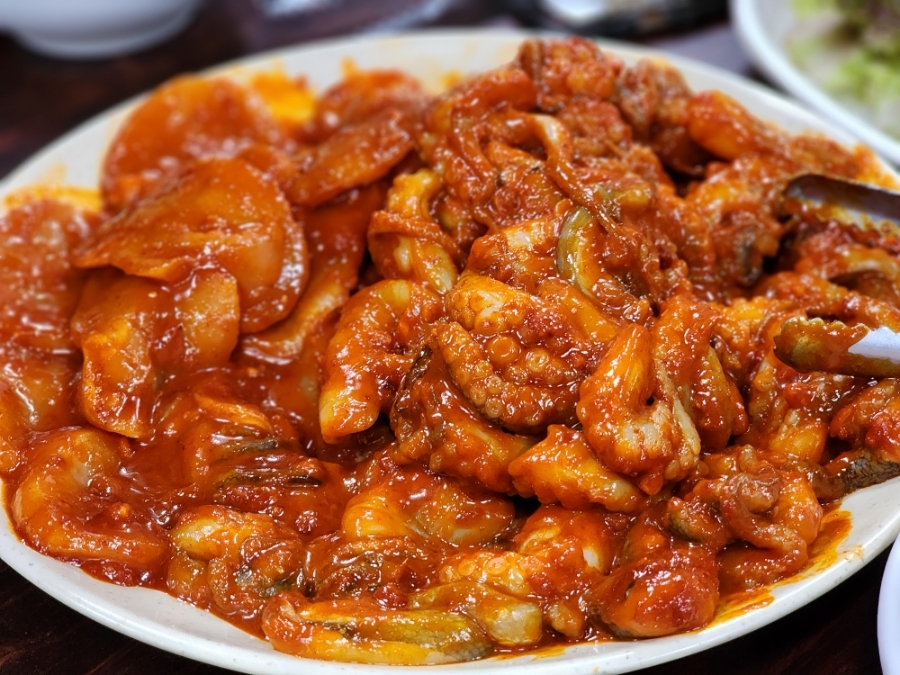 새빨갛게 양념된 쭈꾸미와 키조개 관자