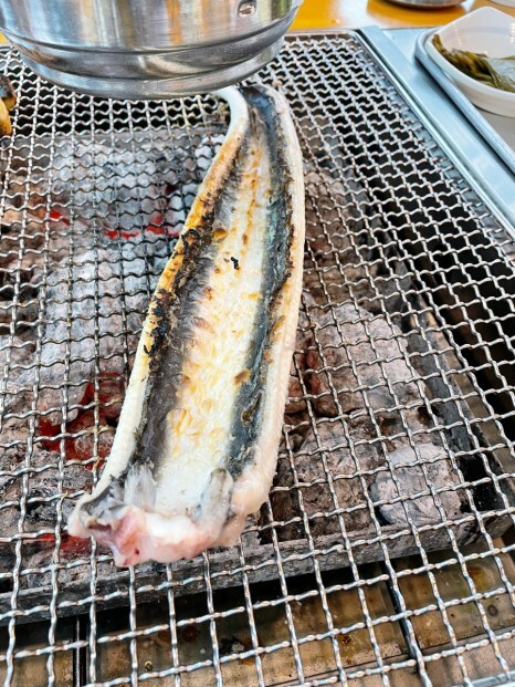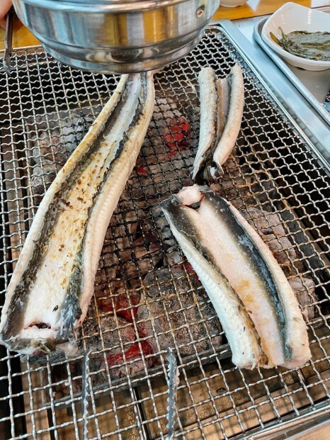 껍질부터 익히고 흰살을 굽기 시작했어요.