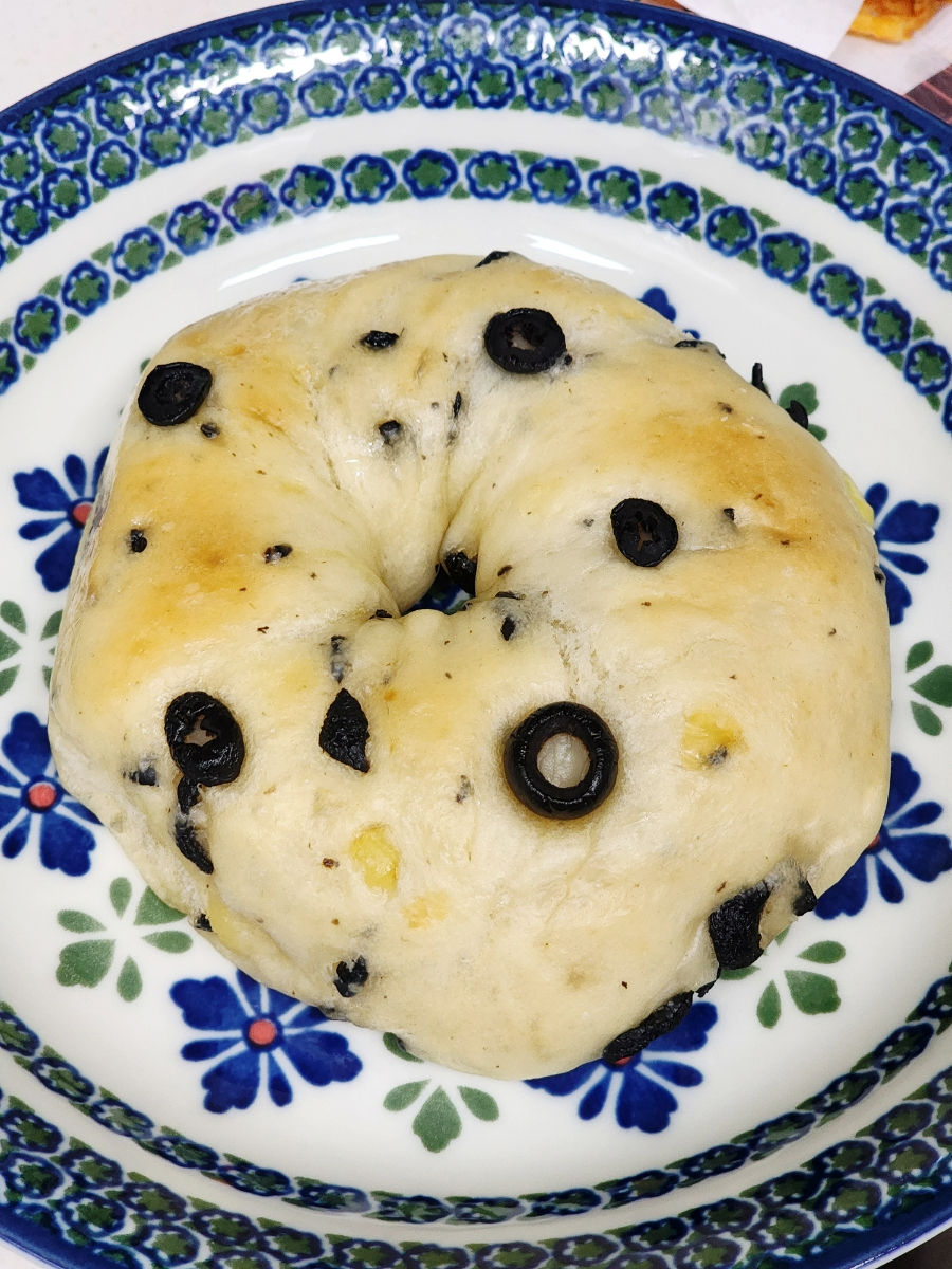 블랙 올리브 베이글, 감자 치즈 베이글, 페퍼로니 치즈 베이글입니다.