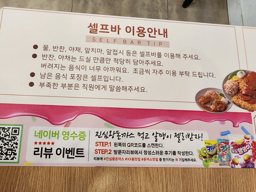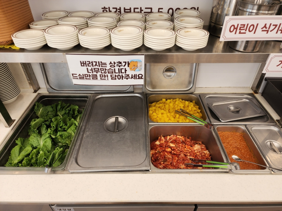 물, 반찬, 야채, 앞치마, 앞접시 등은 모두 셀프바를 이용하면 되는데
