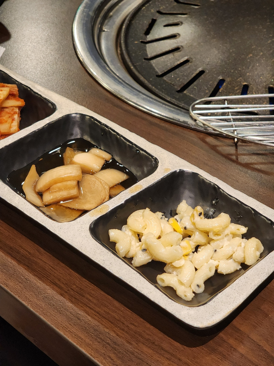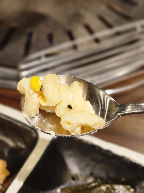 고기가 나오기 전 마카로니가 맛있어서 마구 먹고 있으니