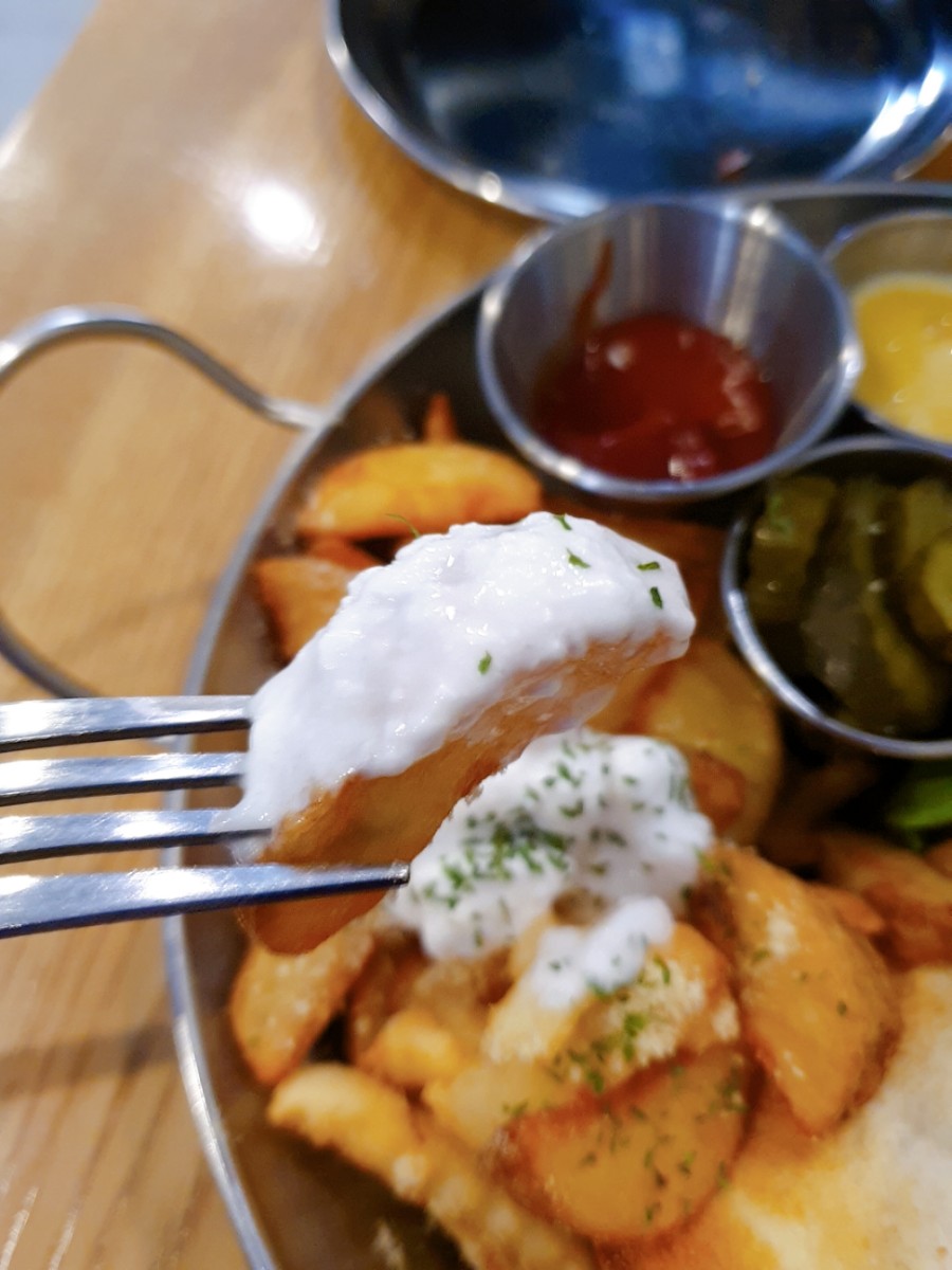그리고 오른쪽 사진은 브런치팩토리 특제 소스에 찍어 먹은 모습입니다.